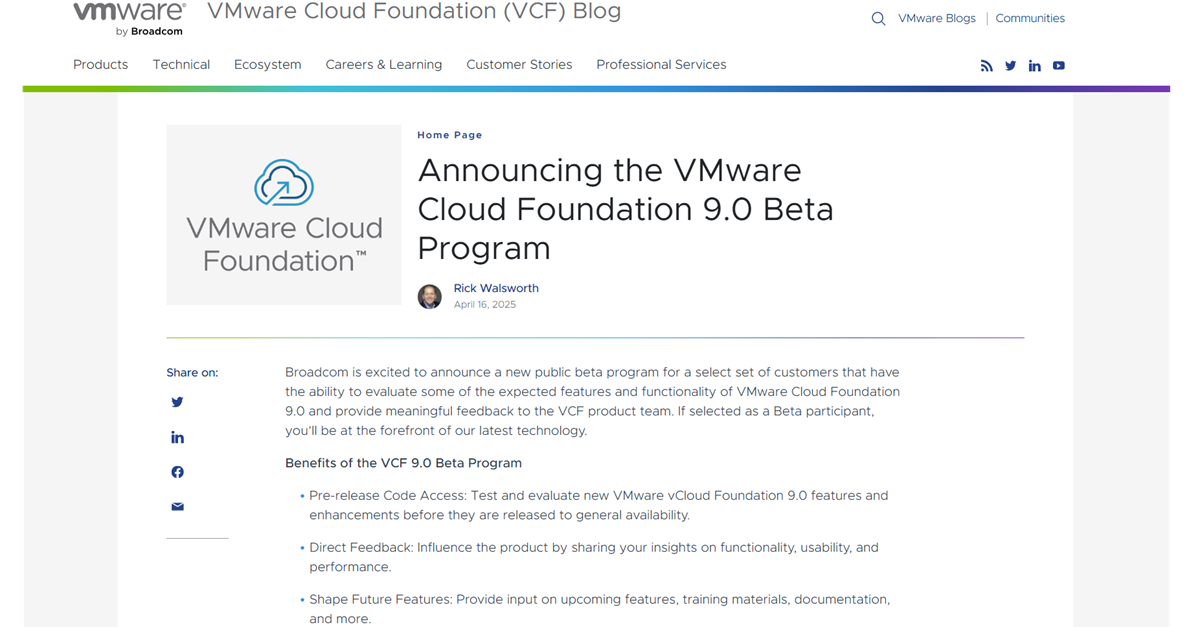 Broadcom is excited to announce a new public beta program for a select set of customers that have the ability to evaluate some of the expected features and functionality of VMware Cloud Foundation 9.0 and provide meaningful feedback to the VCF product team. If selected as a Beta participant, […]